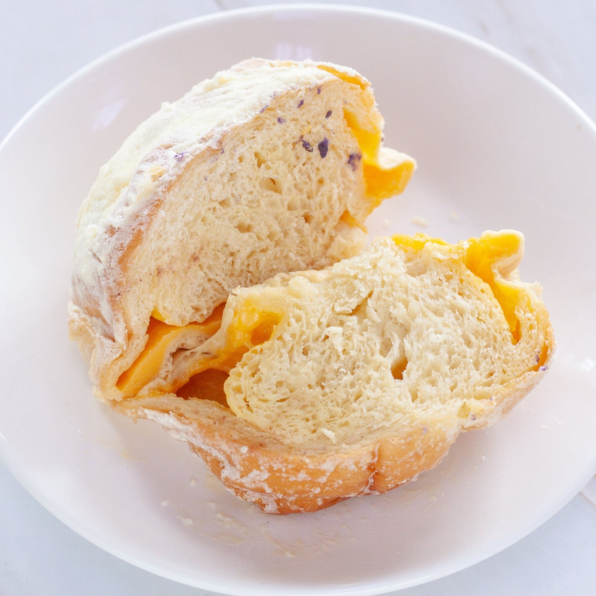 A soft, fluffy pastry filled with melted cheese, topped with buttercream glaze and sugar.