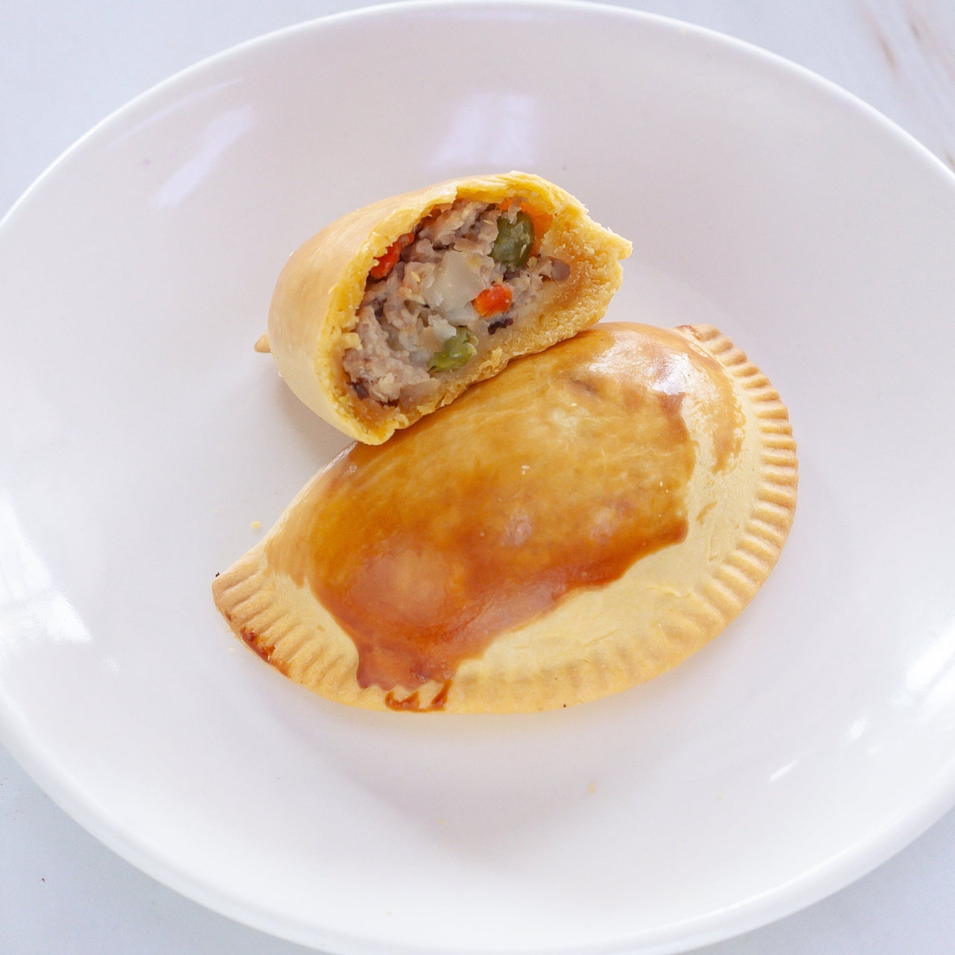 A crescent-shaped, savory pastry heavily filled with seasoned meat-either chicken or pork-mixed with vegetables, baked to perfection.